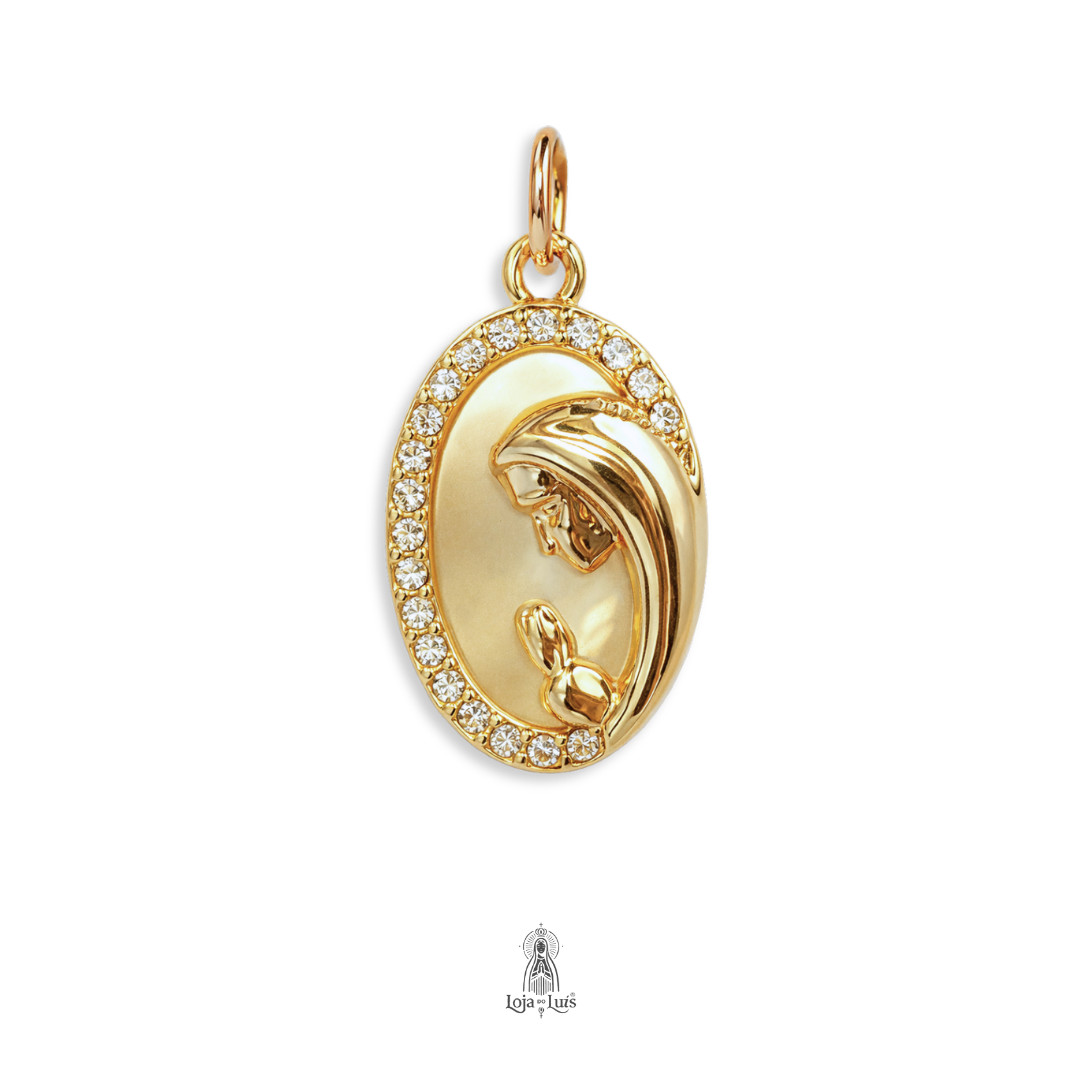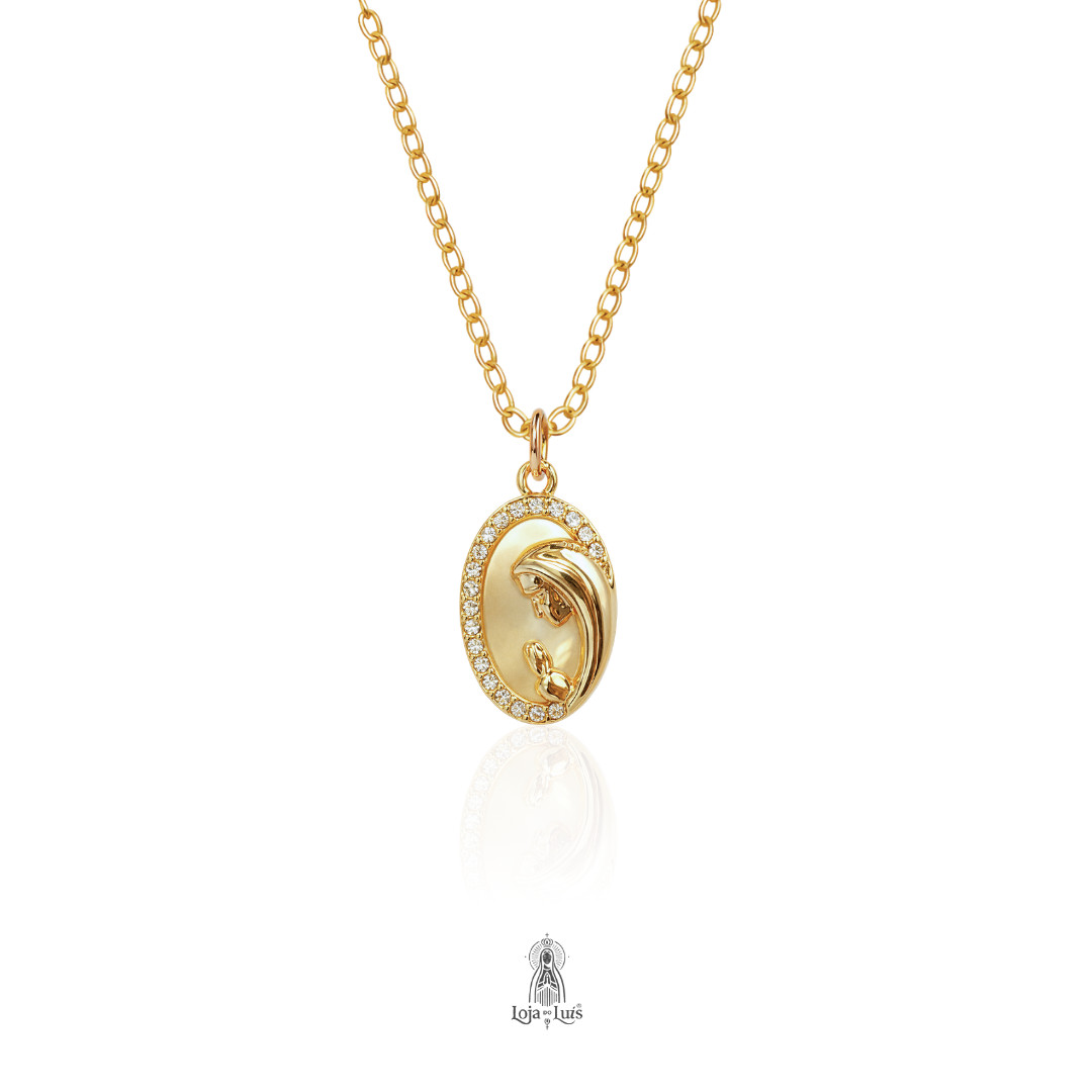 Colar com medalha oval religiosa de Maria, interior em madrepérola e meia lua cravejada com cristais em lapidação brilhantes.