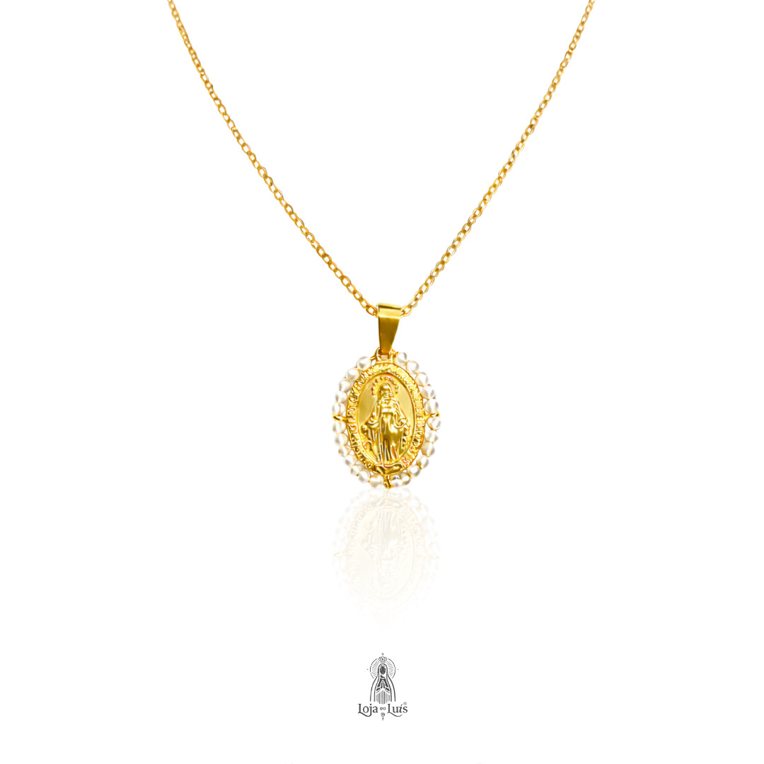 Colar com medalha oval religiosa de Nossa Senhora das Graças (Milagrosa), contorno com cristais coloridos ou pérolas.