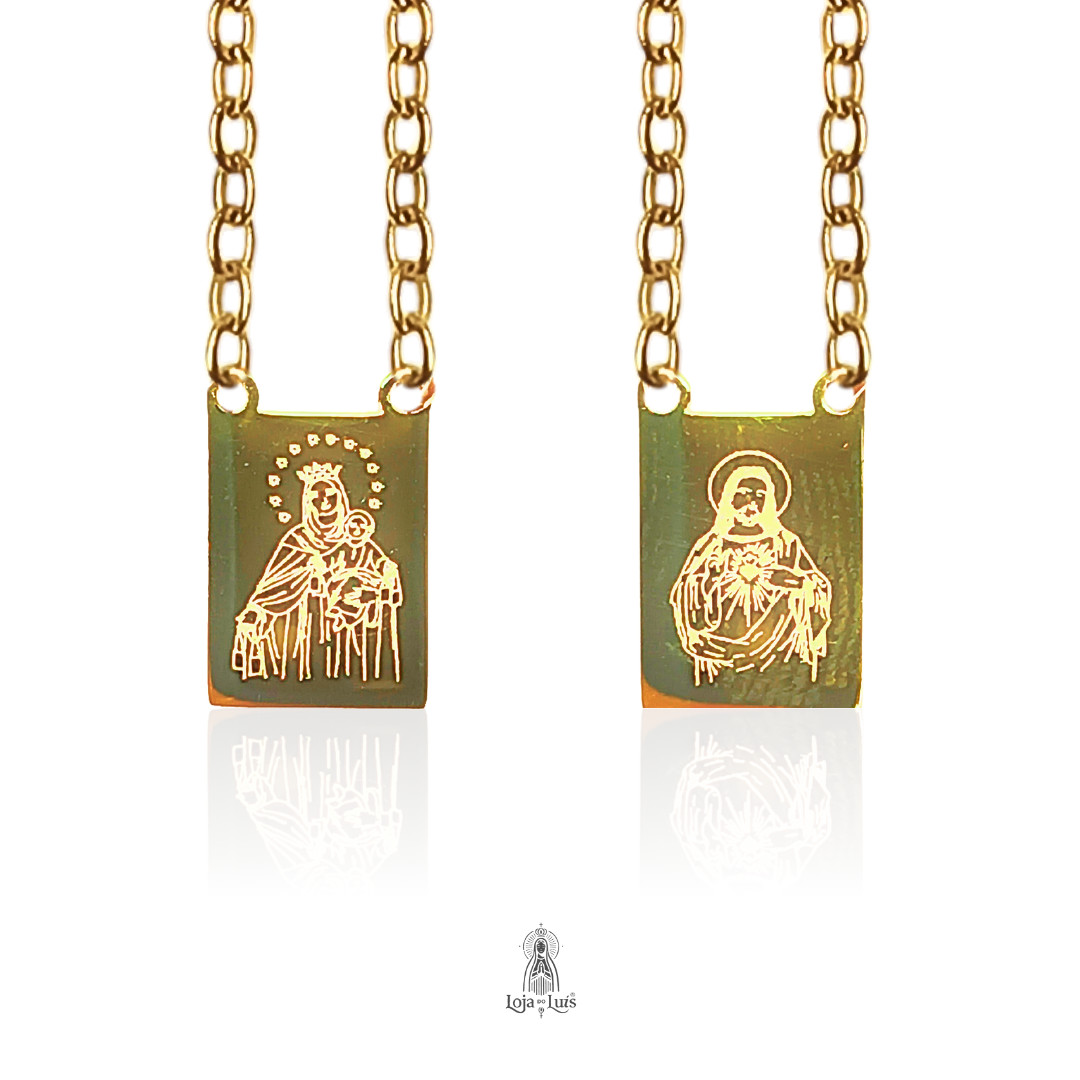 Escapulário Nossa Senhora do Carmo com medalha rectangular gravada.