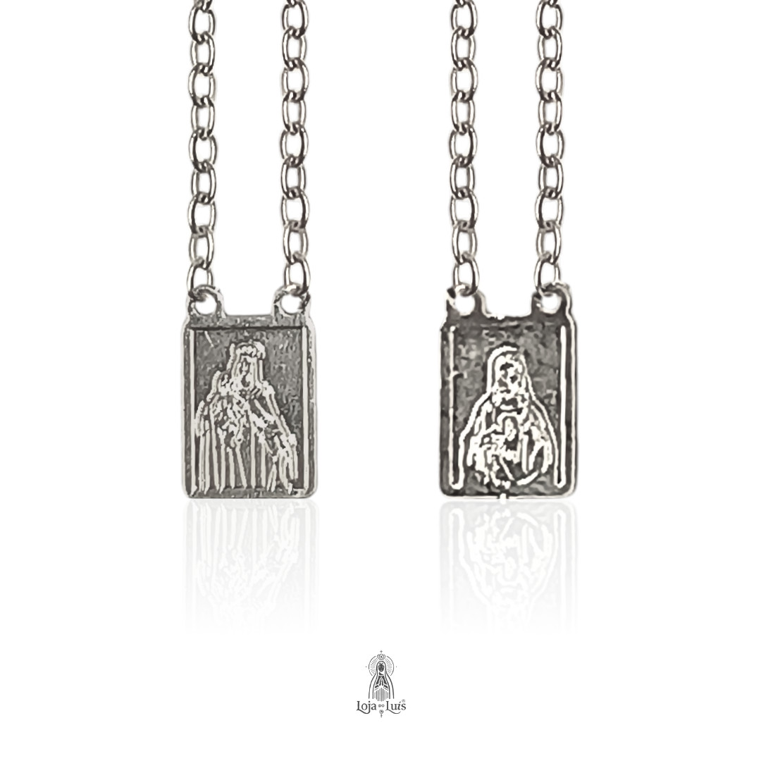 Escapulário Nossa Senhora do Carmo com medalha rectangular em acabamento relevo.