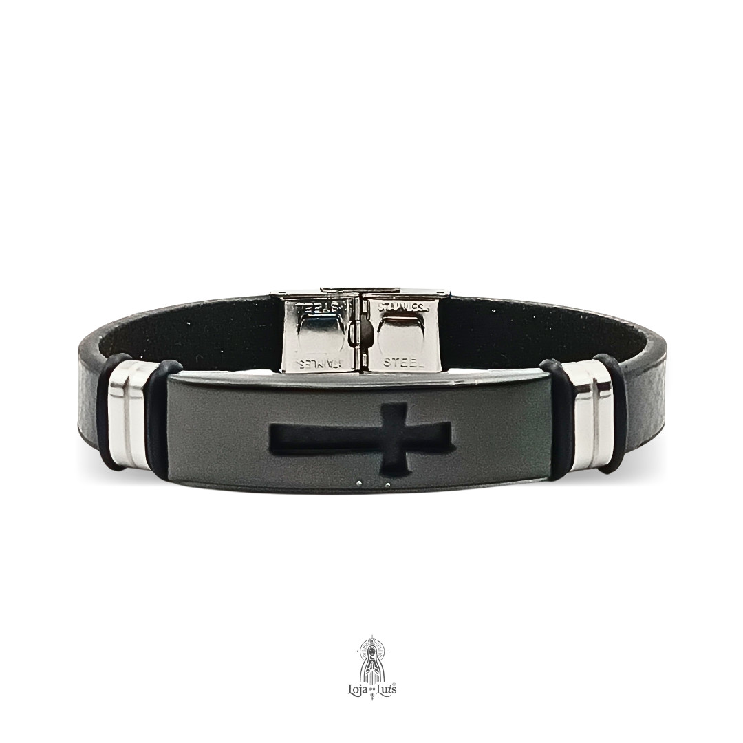 Pulseira em pele lisa com chapa de aço com cruz latina recortada