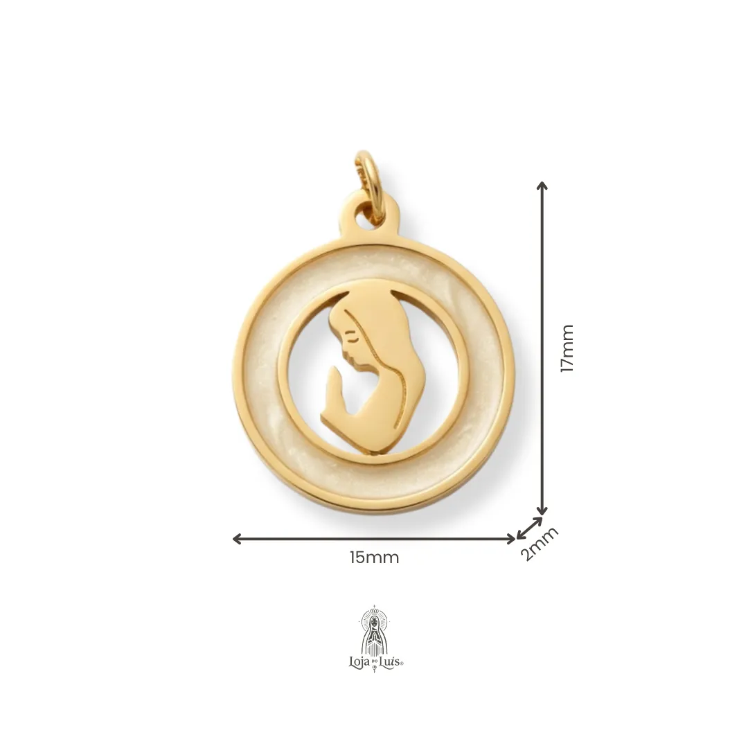 Colar com medalha religiosa de Maria redonda, contorno com recorte, interior em acabamento esmaltado.