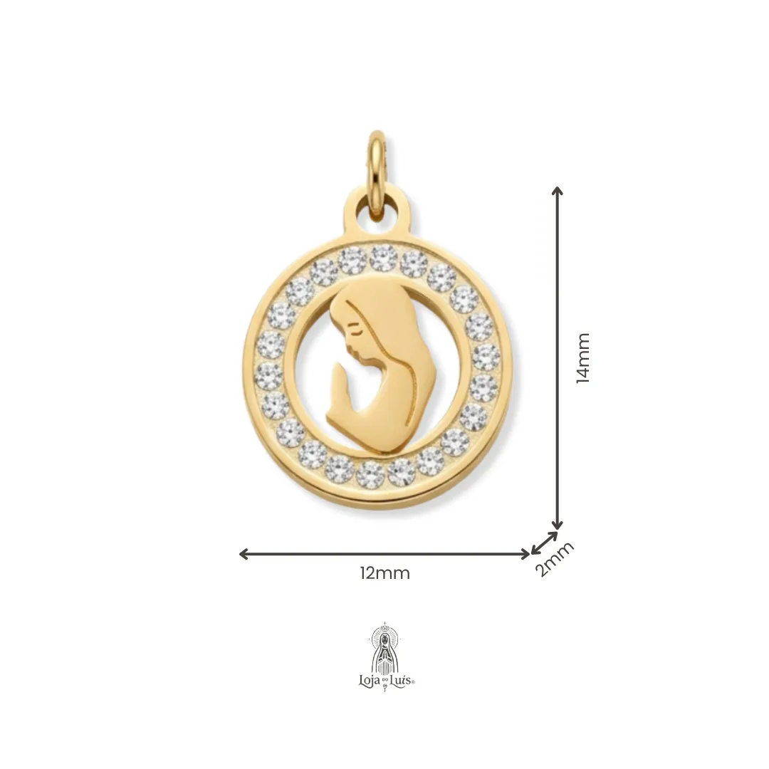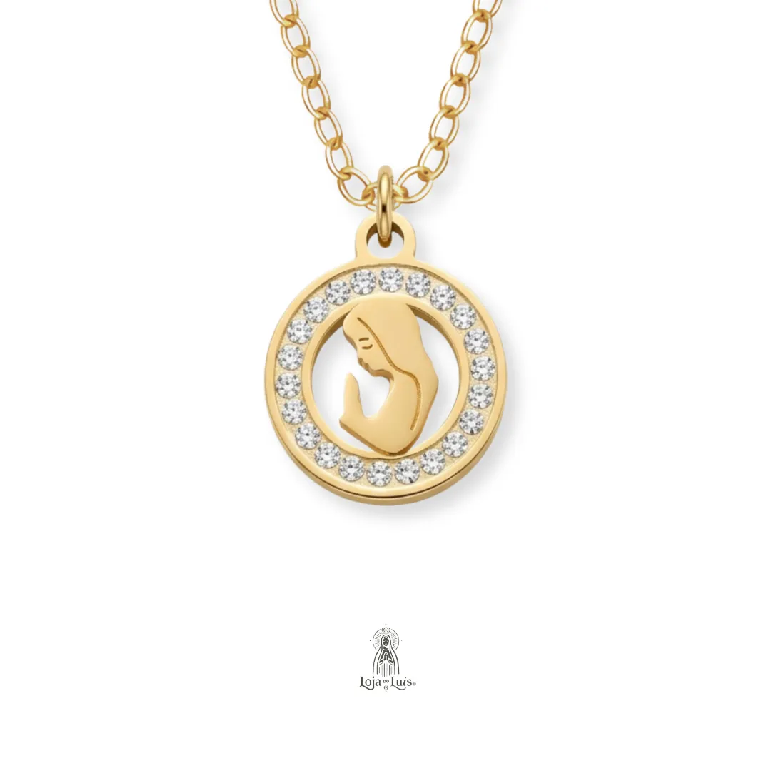 Colar com medalha religiosa de Maria redonda, contorno com recorte, interior em acabamento esmaltado com brilhantes.