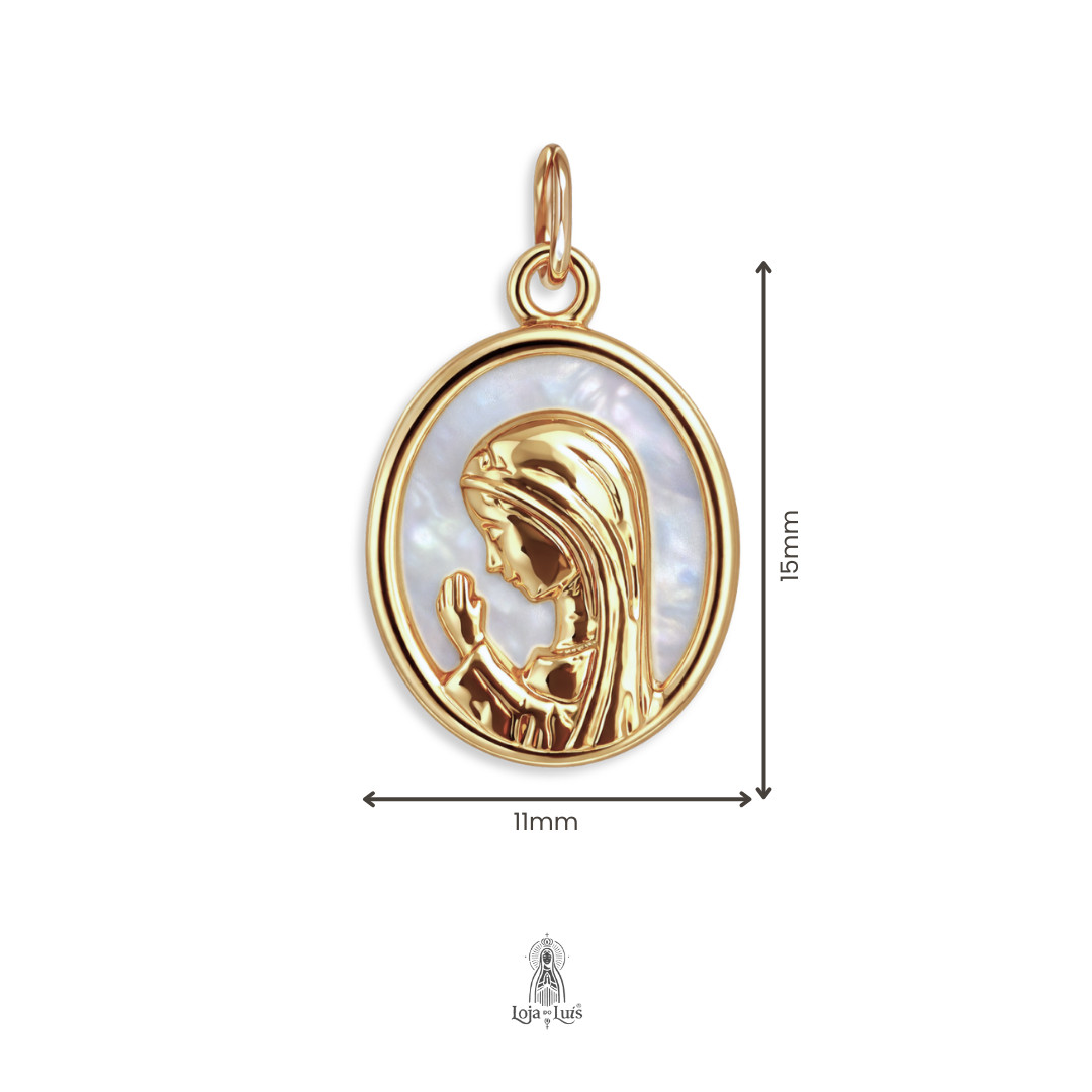 Medalha oval religiosa de Maria, interior em madrepérola.