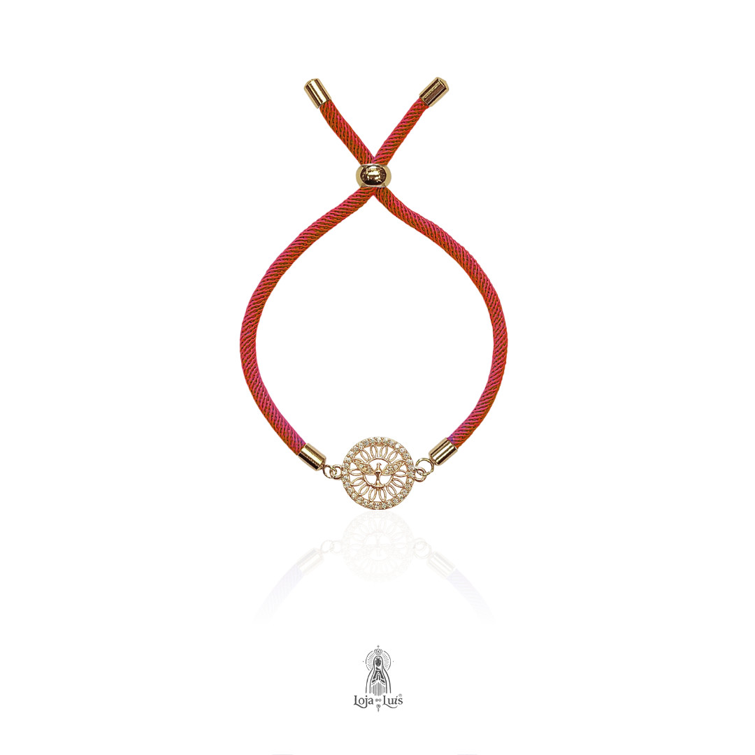Pulseira MESCRAI com medalha religiosa do Espírito Santo, em formato redondo, contorno com cristais em lapidação brilhantes.